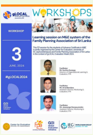 Workshop on learning session on M&E system of the Family Planning Association of Sri Lanka organized by Center for Evaluation in collaboration with FPA As part of the gLOCAL Evaluation Week powered by Global Evaluation Initiative (GEI), CFE organized this special session on the Monitoring and Evaluation system of the FPA held on Monday, 03 June, 2024. We appreciate FPA Sri Lanka for the collaboration and giving this opportunity to the advanced certificate course students and the past students and the resource persons. This one day, faceto- face session offered a unique opportunity learns from FPA’s advanced and comprehensive M&E system. The session was designed to provide with practical experience and enhance understanding of M&E practices in the organization.